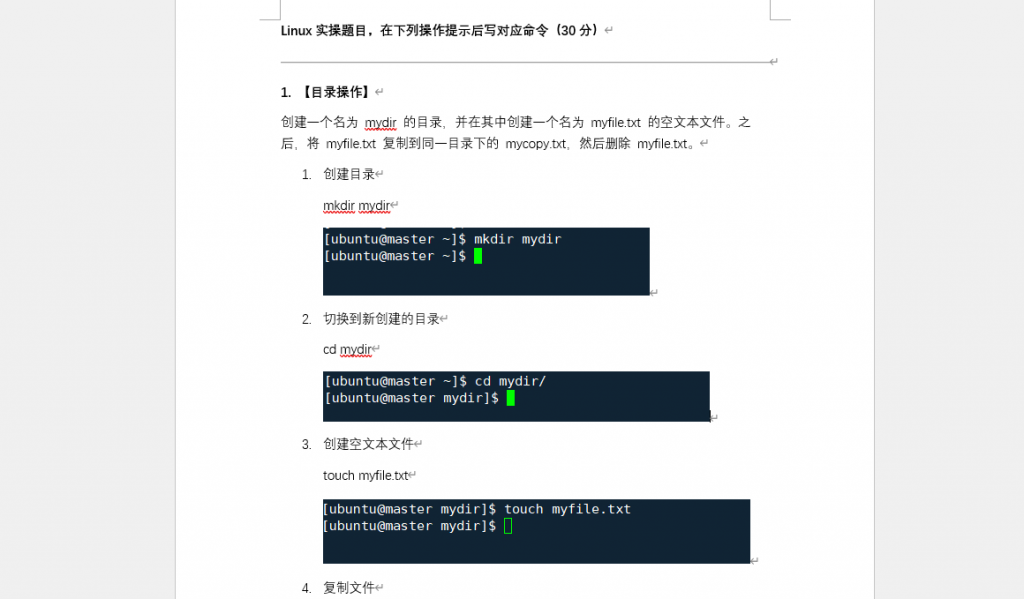 创建一个名为 mydir 的目录,并在其中创建一个名为 myfile.txt 的空文本文件。之后,将 myfile.txt 复制到同一目录下的 mycopy.txt,然后删除 myfile.txt。
