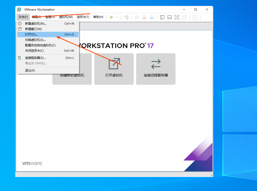 - 打开 VMware Workstation,点击顶部菜单 「文件」→「打开」