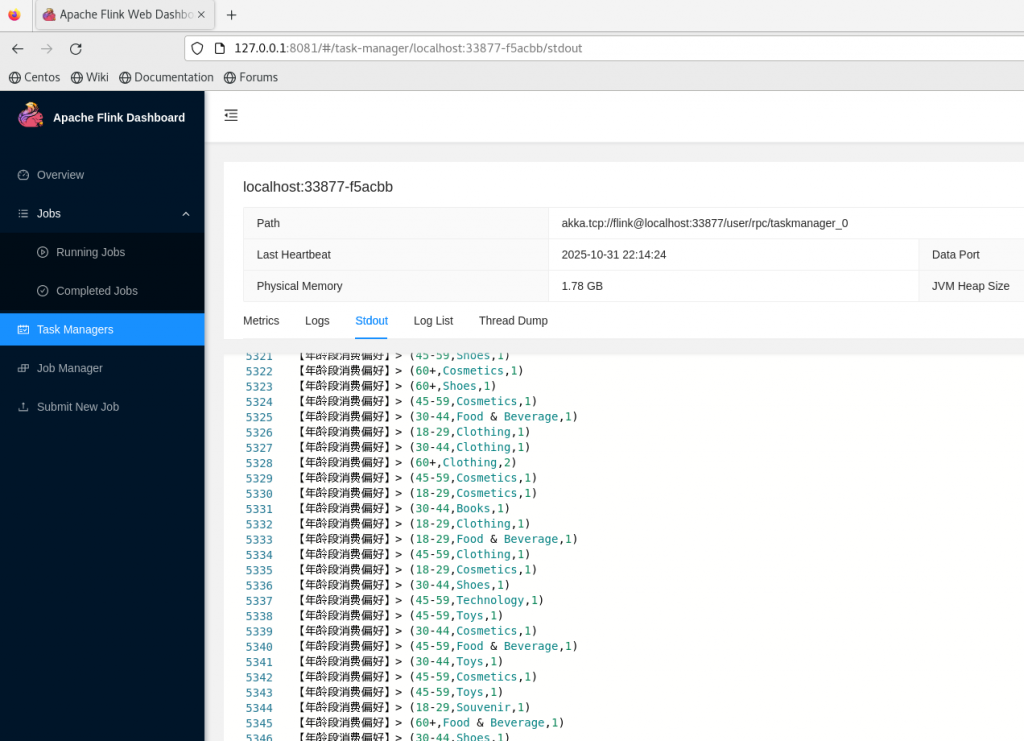 localhost:xxx开头的任务节点 - 在新页面中找到 「Stdout」 标签,即可查看实时输出的分析结果(如商品销量 Top10、用户行为统计等)